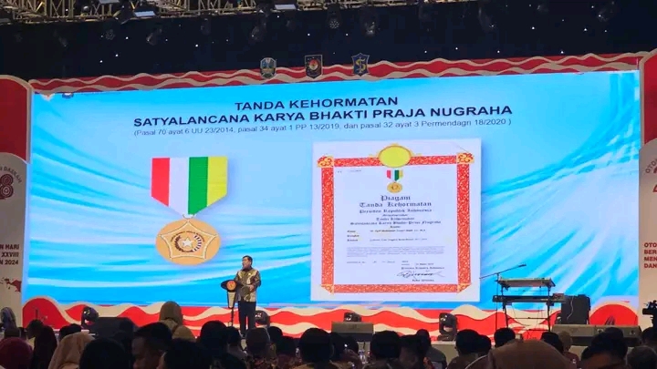 Penjabat Gubernur Jabar Bey Machmudin menerima penghargaan langsung dari Mendagri Tito Karnavian pada Puncak Peringatan Hari Otonomi Daerah di Balaikota Surabaya, Jawa Timur, Kamis (25/4/2024).