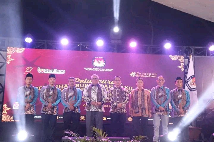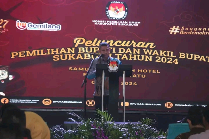 Kuinmas.com-Sukabumi, Bupati Sukabumi H Marwan Hamami menghadiri gelaran peluncuran Tahapan Pemilihan Bupati dan Wakil Bupati Sukabumi Tahun 2024. Jingle dan maskot pun turut diluncurkan malam ini di Grand Inna Samudera Beach Hotel (GISBH) Palabuhanratu, Kecamatan Cikakak, Sabtu, 8 Juni 2024.