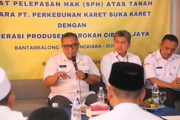 Penandatanganan Surat Pelepasan Hak (SPH) dari PT. Perkebunan Karet Suka Karet kepada Koperasi Produsen Barokah Cibandi Jaya. SPH tersebut merupakan Penyisihan 20% lahan dari Luas Areal Perkebunan Suka Karet yang berlokasi di Desa Bantarkalong Kecamatan Warungkiara.